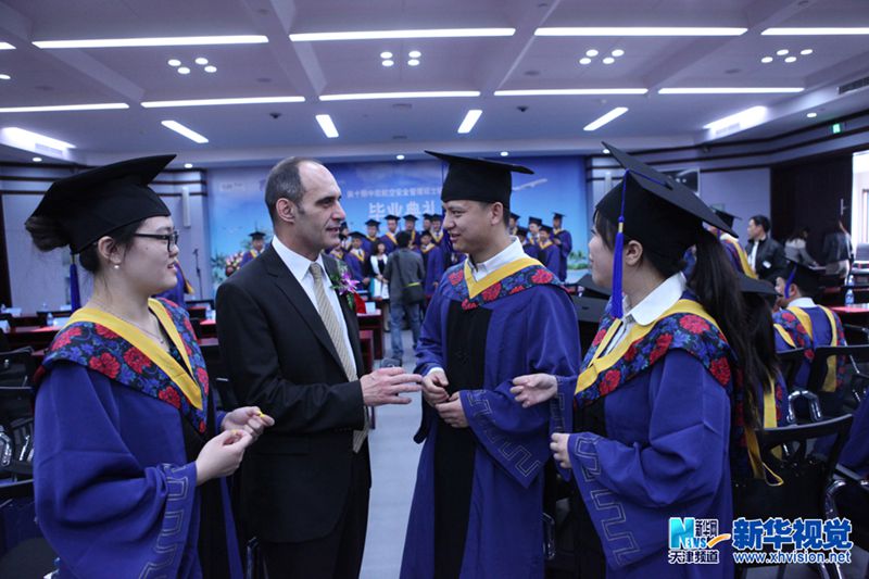 4月16日,在毕业典礼上,中外嘉宾为中国民航大学第十期中欧航空安全管理硕士毕业生拨穗