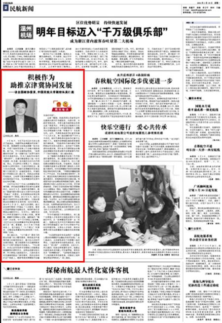 记者了解到,民航局局长李家祥去年应邀到天津市作专题报告,天津市委、市政府很受启发,目前已就当地民航业发展达成了高度共识,并将过去以海港为主发展北方国际航运中心和国际物流中心调整为以实现海港与空港“双港齐飞”为发展方向。去年,天津机场旅客吞吐量首次破千万人次大关,第二航站楼即将于今年6月启用,届时天津机场的旅客吞吐量可达2500万人,地铁和京津城际高铁将直接连到天津机场。“民航局和天津市都对天津民航业的支持力度很大,这有助于天津机场的快速发展,同时也为天津民航业在推动京津冀协同发展过程中发挥重要作用打下了良好的基础。”吴仁彪如是说。