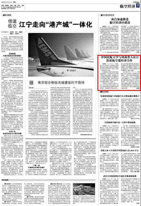 《中国民航报》7版:中国民航大学与河南省人社厅洽谈航空港经济合作