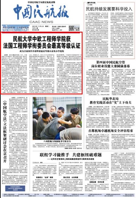 《中国民航报》头版头条:民航大学中欧工程师学院获法国工程师学衔委员会最高等级认证
