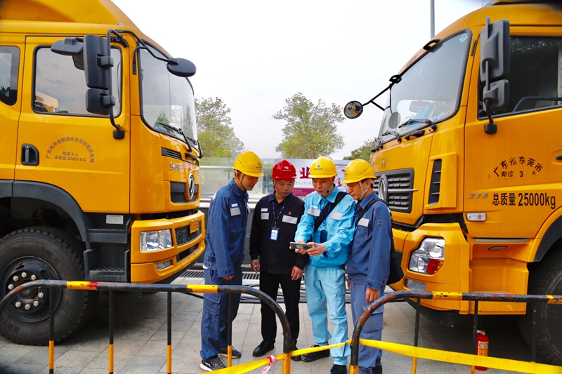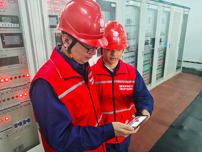 10月1日上午,南方电网广东东莞城区供电局保电工作人员检查完设备后,在工作现场用手机观看直播。图片由南方电网广东东莞城区供电局提供