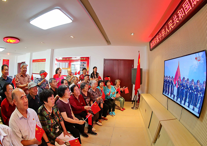 河北省秦皇岛市海港区东环路街道东环里社区党员群众共同收看庆祝新中国成立70周年阅兵式。图片由河北省秦皇岛市海港区委宣传部融媒体中心提供