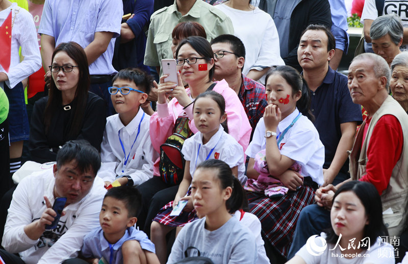 郑州街头,市民围坐在大屏幕面前观看庆祝新中国成立70周年阅兵式。慎志远摄