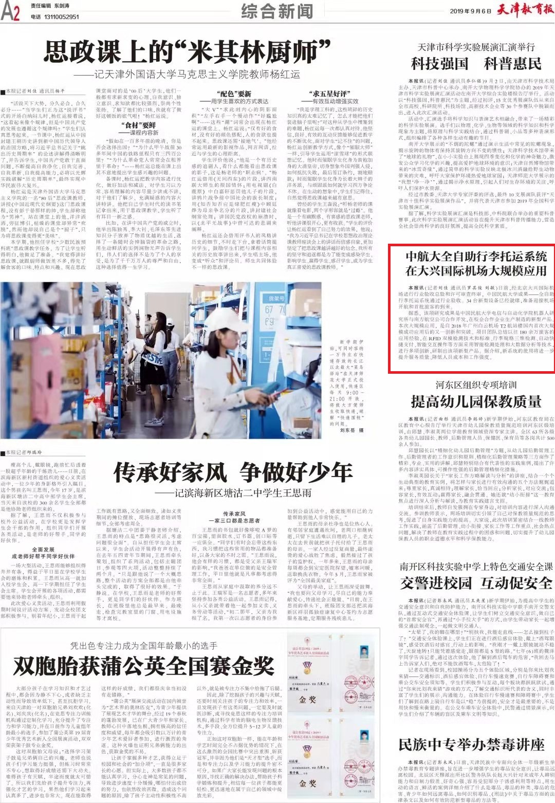 《天津教育报》:中航大全自助行李托运系统在大兴国际机场大规模应用