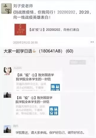 学工办与外国语学院团委携手发布《致外国语学院全体学生的一封信》,向学生群和家长群发布,统一全院思想、协同防疫步调。系列战”疫“宣传推送指导学生在特殊时期,做好防护工作,加强锻炼、提升素养、坚持学习,为返校后的学习与生活做好准备。