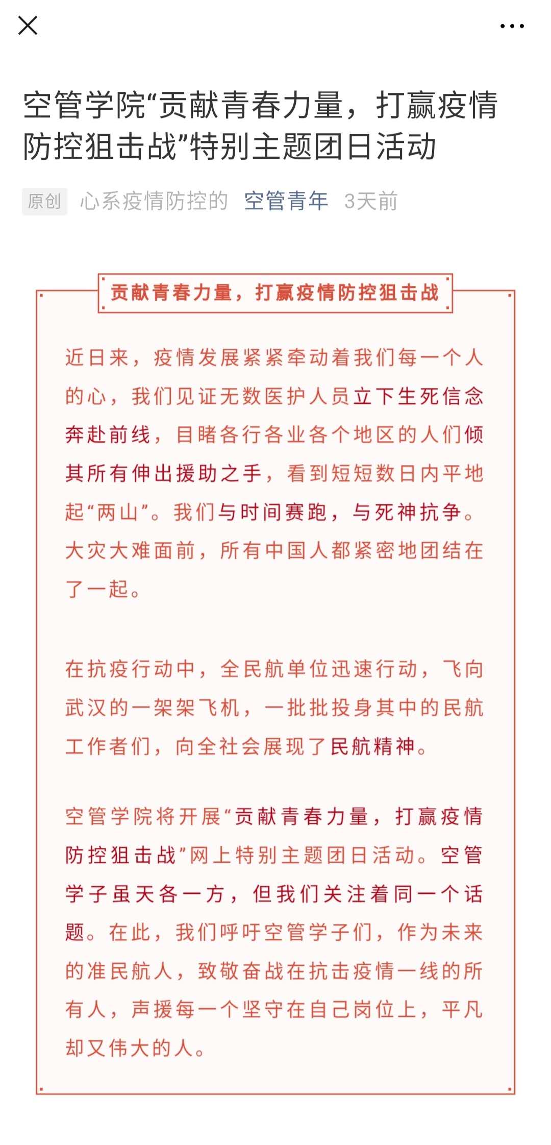 在疫情防控阻击战中,中国民航大学的团员青年在行动!日前,学校团委组织开展“贡献青春力量 打赢疫情防控阻击战”网上特别主题团日活动,提出以下五点倡议