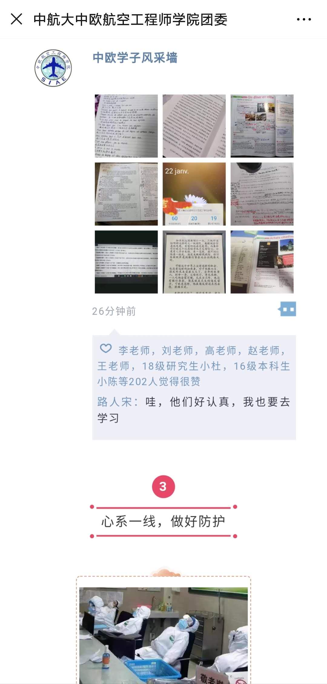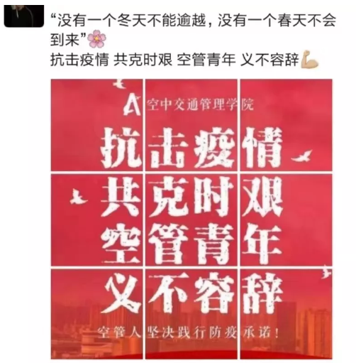 空管学院团委制作了“抗击疫情 共克时艰 空管青年 义不容辞”的壁纸,致敬最美逆行者和每一位为疫情防控阻击战做出贡献的人。空管学院2018级团总支向广大团员发出“坚定制度自信,打赢防控疫情阻击战”的号召:坚定制度自信,不信谣。不传谣,积极参与防疫舆情引领工作。
