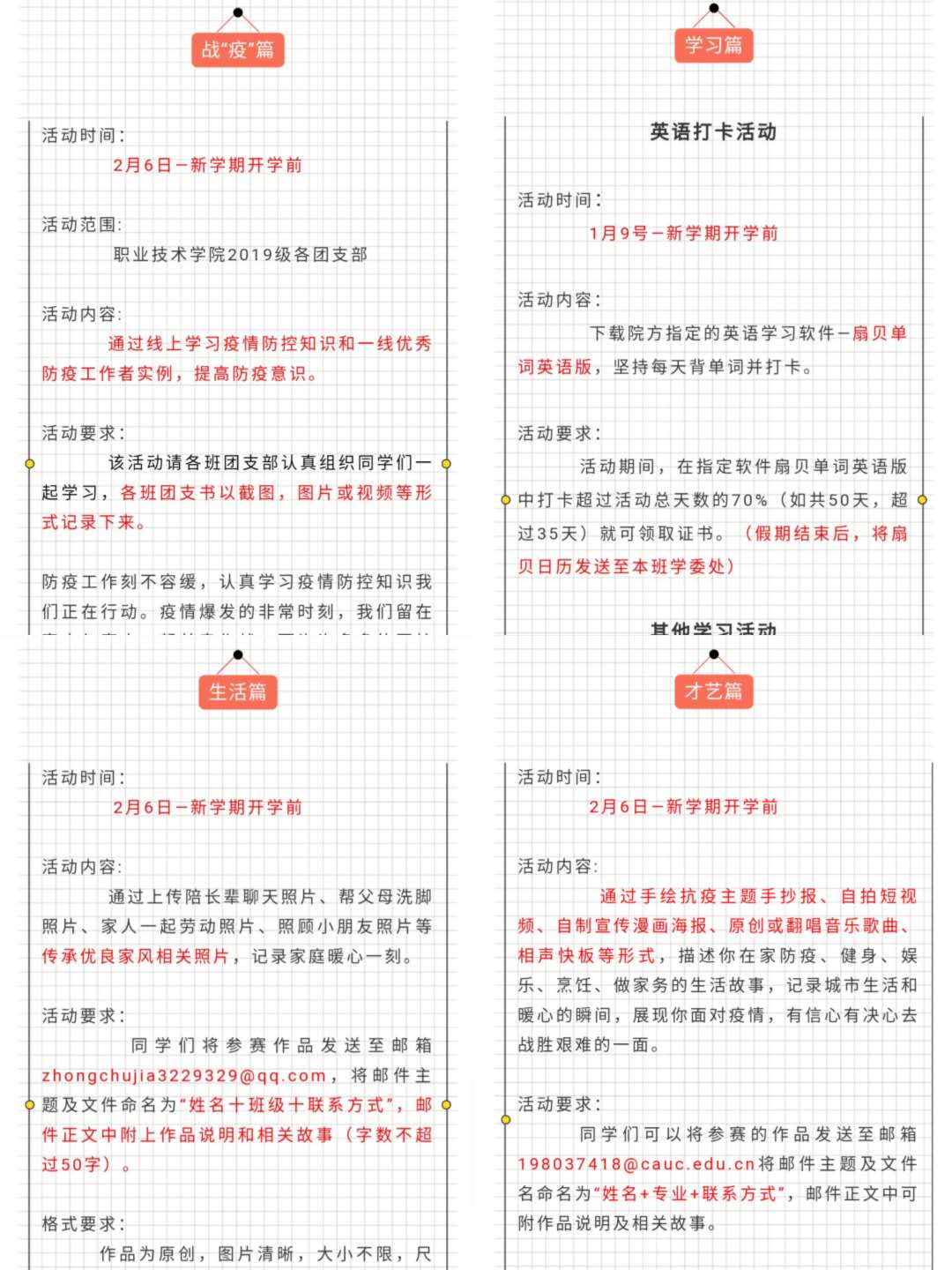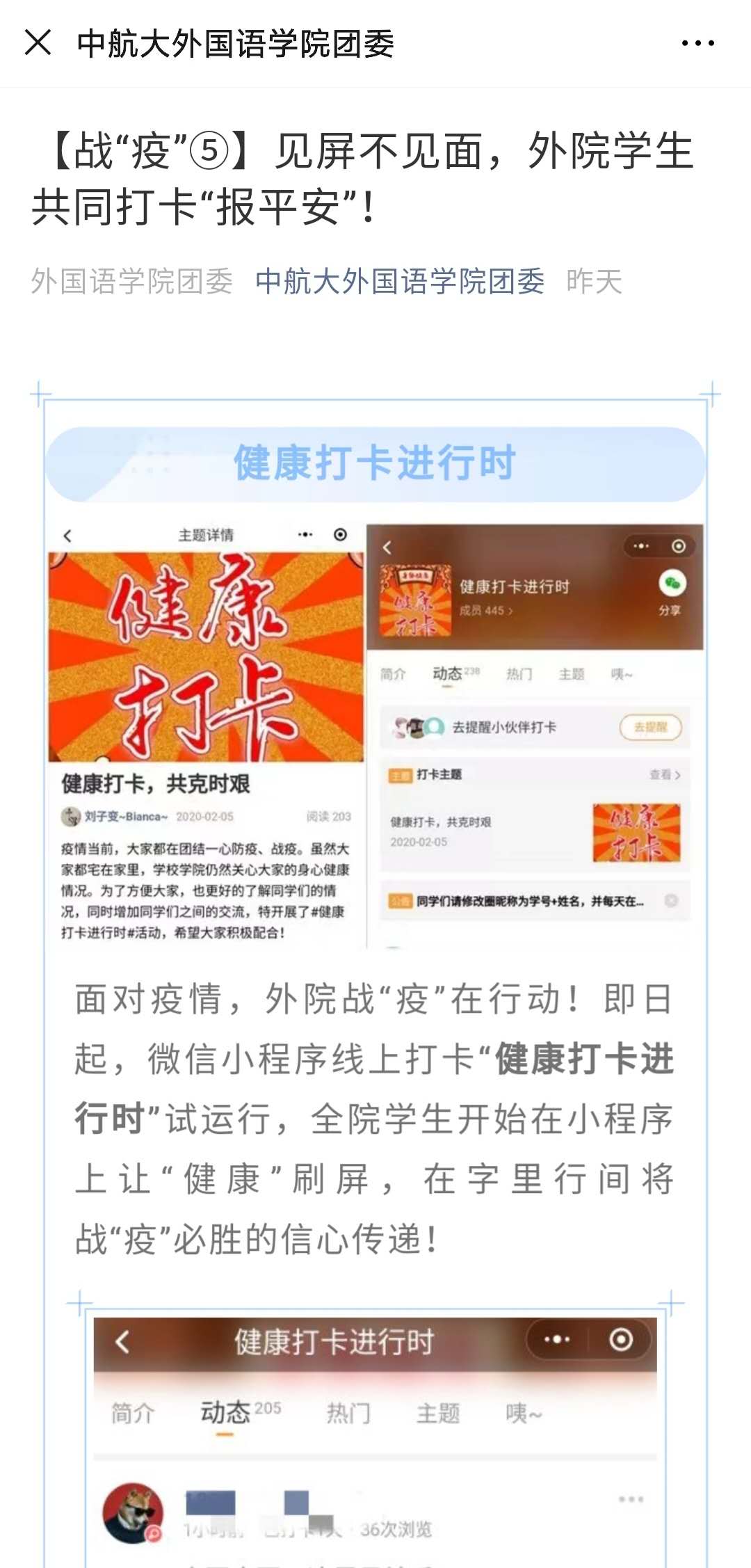 飞行技术学院团委在假期中开展了飞院学子寒假打卡活动,以生动有趣的方式督促同学们进行英语学习和读书看报,活动中同学们秀词汇、秀作文、秀配音,谈感悟、写心得、秀文采,打卡活动让同学们的“宅家”生活丰富起来。