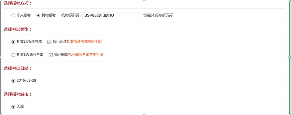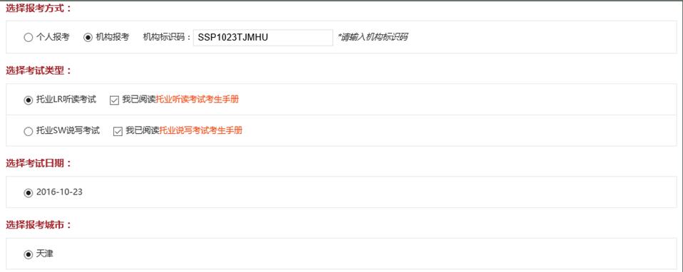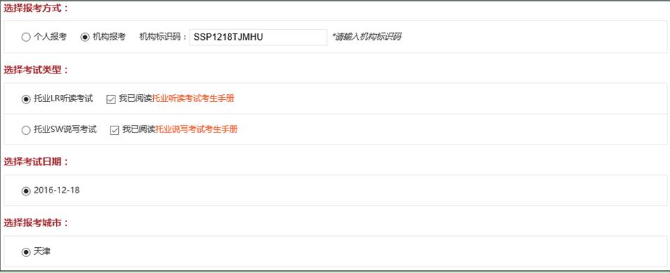 中国民航大学的考生,在选择报考方式时,请选择机构报考,同时填写相对应的机构标识码(只有填写机构代码,才可在本校考试),如下图所示:(三次考试对应三个不同的机构标识码,请仔细核对)