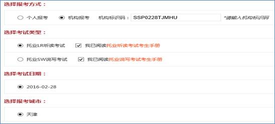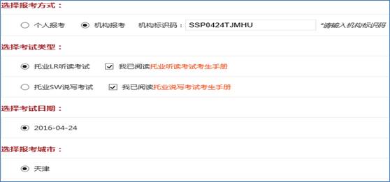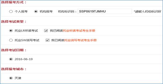中国民航大学的考生,在选择报考方式时,请选择机构报考,同时填写相对应的机构标识码(只有填写机构代码,才可在本校考试),如下图所示:(四次考试对应四个不同的机构标识码,请仔细核对)