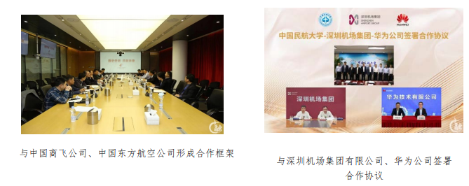 与中国商飞共建大飞机绿色发展联合研究中心,开展前沿大飞机绿色技术研究,并就进一步促进国产大飞机首次投运的运维保障和民航高质量人才培养等事宜与中国商飞公司、中国东方航空公司形成合作框架,建立联合攻关机制。同时,与华为技术有限公司、深圳市机场(集团)有限公司在智慧机场领域签署战略合作协议,搭建“产学研用”协作平台,服务新时代民航强国建设、服务深圳建设中国特色社会主义先行示范区。