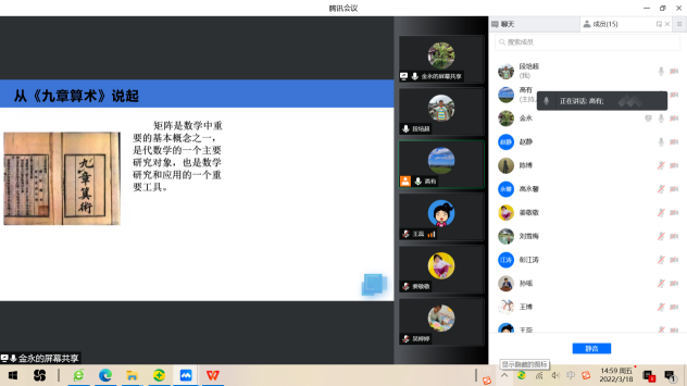 团队聘任之初,高有教授多次组织召开线上会议,逐步形成团队内部的沟通制度、教研制度等长效管理机制,制定聘期建设计划,将聘期任务分解至各年度。团队每两周至少研讨一次,重点研究如何通过教育教学改革,产出一批高质量的教学成果,落实立德树人根本任务,创新团队建设工作稳步推进。近期团队主要做了如下工作:凝练“新工科背景下《线性代数》课程的教学改革与实践”教学成果;加强天津市一流本科建设课程《线性代数》的课程资源建设;进行《线性代数》、《数学分析》课程思政案例建设,精心制作课程思政课件和视频,将各门课程蕴含的思政育人元素有机融入课程教学设计中,做到润物无声、春风化雨。