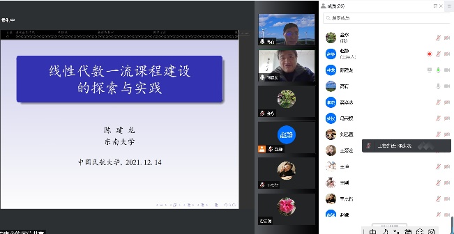 围绕“一流专业、一流课程”的建设进行了多次研讨。团队于2021年11月23日邀请教育部高等学校数学类专业教学指导委员会委员、南开大学数学学院邓少强教授做关于“Homogeneous Finsler Spaces”的报告;2021年11月26日邀请教育部高等学校数学类专业教学指导委员会委员、天津大学数学学院院长孙笑涛教授做关于“一流专业、一流课程”建设的报告;2021年12月14日组织召开“线性代数教学研讨会”,邀请教育部高等学校大学数学课程教学指导委员会委员、北京大学冯荣权教授、东南大学陈建龙教授做“一流课程”建设报告并研讨。