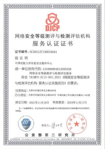 中国民航大学信息安全测评中心(民航信息安全管理与测评中心),作为民航行业唯一的网络安全监管与服务技术支撑机构,具有国家网络安全等级测评与检测评估机构服务认证证书。自2013年成立以来一直在网络安全领域深耕不辍,致力做好民航网络空间的“护林员”。在习近平新时代中国特色社会主义思想指导下,在民航局、学校支持下,大力宣传贯彻网络安全工作责任制,全面加强民航网络安全保障体系建设,在民航网络安全监管、应急保障、宣传教育、国际交流、社会服务和科学研究等方面取得显著成果,成为民航网络安全领域不可或缺的重要支撑力量,为建设民航强国提供有力的网络安全保障。