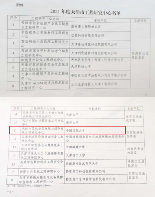 本网讯 近日,天津市发改委发布2021年度天津市工程研究中心名单,中国民航大学牵头建设的“天津市民航能源环境与绿色发展工程研究中心”获批认定。