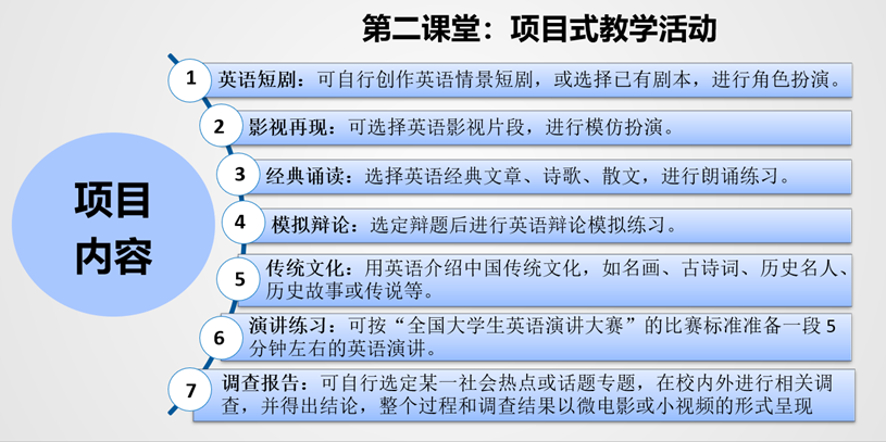 小组合作项目式学习(Project-based Learning)是大学英语课程的一大特色和亮点,项目式学习贯穿整个学期。课程组通过集体教研,结合课程学习内容和学生兴趣水平,确定每学期的项目选题和呈现形式,并在每学期第一节课的导学环节公布,同学们可以对项目设置提出相关建议。
