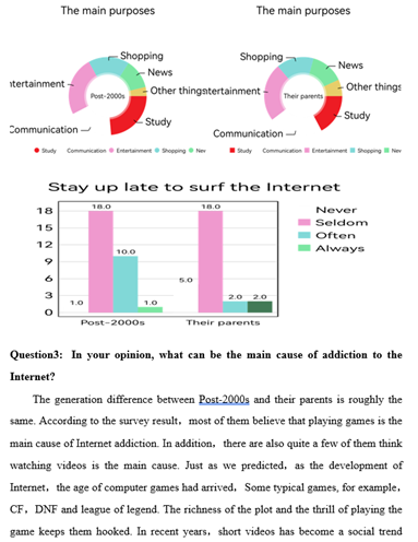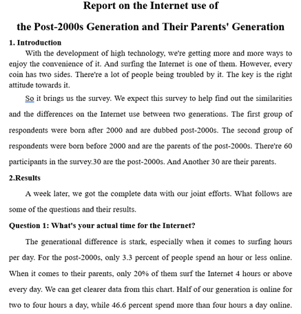 针对代沟、绿色校园等话题,同学们展开问卷和实地调查采访,收集整理数据,撰写详实的调查报告,录制口头汇报。