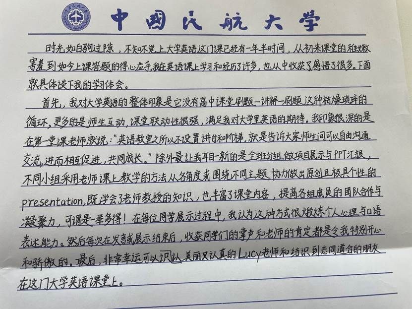 大学英语算是我收获最多的一门课程,不单单收获了英语知识,更重要的是学会了如何使用英语知识,了解了知识背后的文化,思维方式,学习到了各项技能,结识了可爱的老师和同学们,真的是一趟令人回味无穷并且受益终身的旅程。
