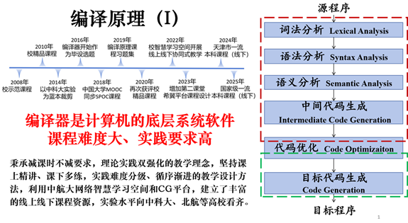 编译原理是计算机科学与技术专业的专业基础课,主要讲述从高级语言等价翻译为机器语言的原理与方法,与之配套的“编译原理课程设计”是一门实践课程。课程对理论及实践要求高,课程难度大。面对教学过程中理论课时缩减与教学内容多、课程难度大的矛盾,以及课程实践要求高与学生程序设计能力弱、水平差距大的矛盾,以“培养学生的计算机系统能力”为宗旨,以“学生学完本课程后能够设计与实现一个功能较为完整的编译器”为教学目标,课程组确立了“减课时不减要求,理论实践双强化”的教学理念,通过优化教学内容,按课时重新组织教案和课件;线上线下协同,理论课内容精讲,线上客观题练习注重知识点细节,线下练习注重知识点综合利用;课程设计难度分级,照顾不同水平的同学,同时使用希冀平台进行严格考核等一系列举措,提高教学质量。