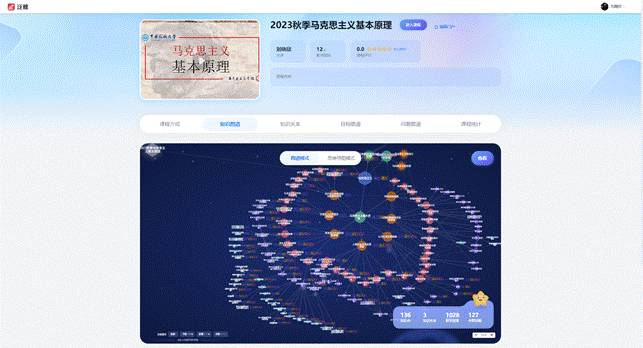 《马克思主义基本原理》以超星平台为依托,建立知识图谱实现混合式教学,包含知识点136个,知识关系3个,教学资源1028个,关联试题数127个。