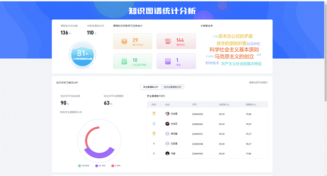 7、强化过程,全面考核。课程知识图谱的建设使用,有助于通过完整连贯的学习数据和智慧教学平台统一的成绩生成管理,实现过程性与结果性相结合的全流程、科学、精准的评价体系。