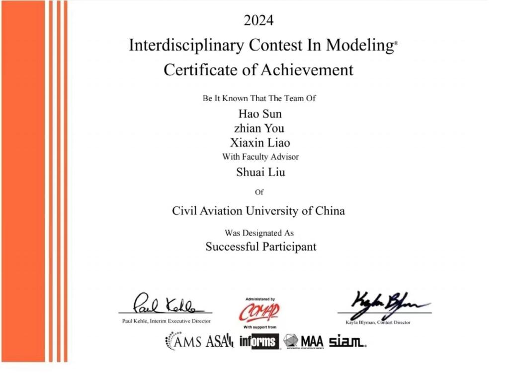本网讯 日前,2024年美国大学生数学建模竞赛(MCM/ICM)获奖名单揭晓,中国民航大学获佳绩。空中交通管理学院教师赵纬经指导的5支竞赛团队荣获国际一等奖(Meritorious Winner1项,国际二等奖(Honorable Mention)1项,国际三等奖(Successfully Participant3项。安全科学与工程学院教师刘帅、空中交通管理学院教师夏庆军分别指导竞赛团队获国际三等奖Successfully Participant空中交通管理学院智慧交通社团组织参赛团队8支,获国际二等奖(Honorable Mention)1项,国际三等奖Successfully Participant)7项