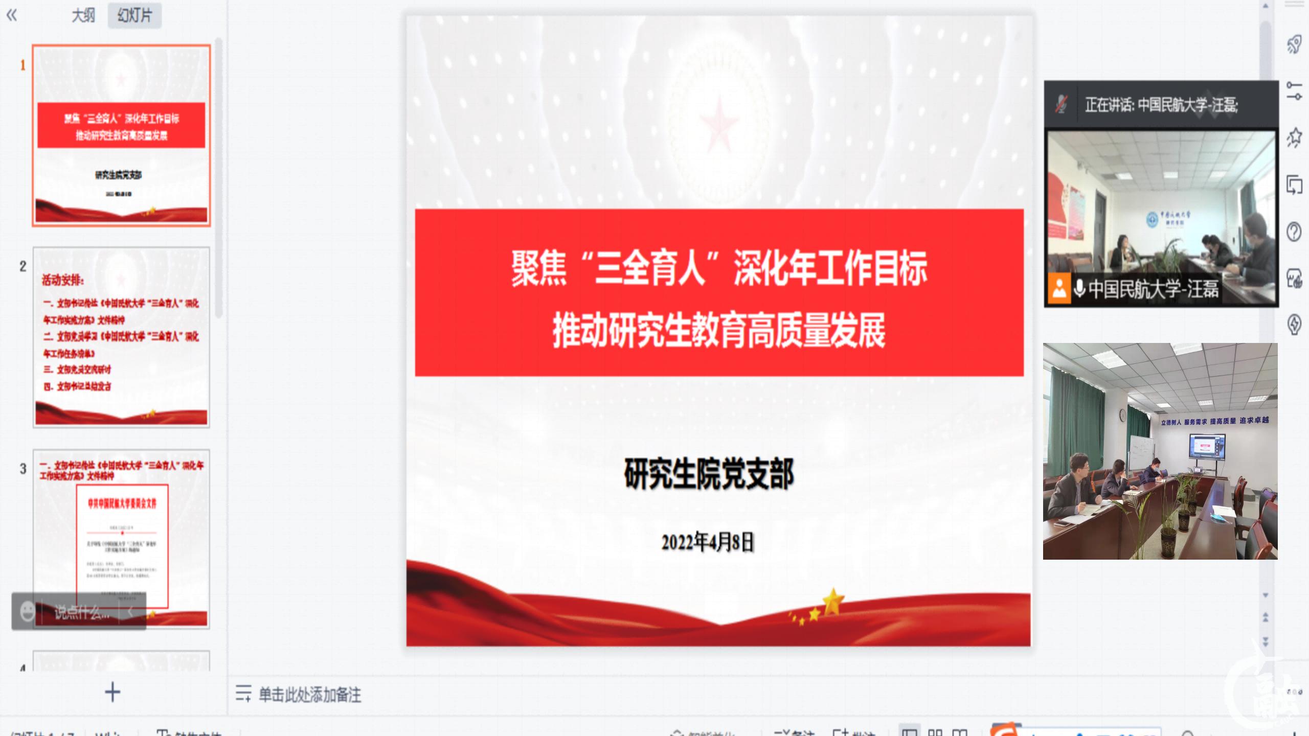 研究生院党支部开展以“聚焦‘三全育人’深化年工作目标,推动研究生教育高质量发展”为主题的党日活动,本次党日活动采用“线上+线下”的形式开展,研究生院党支部全体党员参加。支部书记带领支部党员学习《中国民航大学“三全育人”深化年工作实施方案》,同时结合2022年工作计划,进一步明晰了“三全育人”深化年工作的重要意义、目标任务、工作安排及工作要求。支部党员马凯表示,“课程育人”是“三全育人”工作的重要内容,要以2022版培养方案修订为契机,持续推进研究生思政课程建设和课程思政建设,进一步凸显课程教学实效。支部党员万小艳表示,导师是研究生培养的第一责任人,导师队伍建设是研究生“三全育人”人才培养综合改革的关键,要结合导师培训,进一步提高导师的育人意识,做到全过程育人、全方位育人,使其成为研究生成长成才的指导者和引路人。