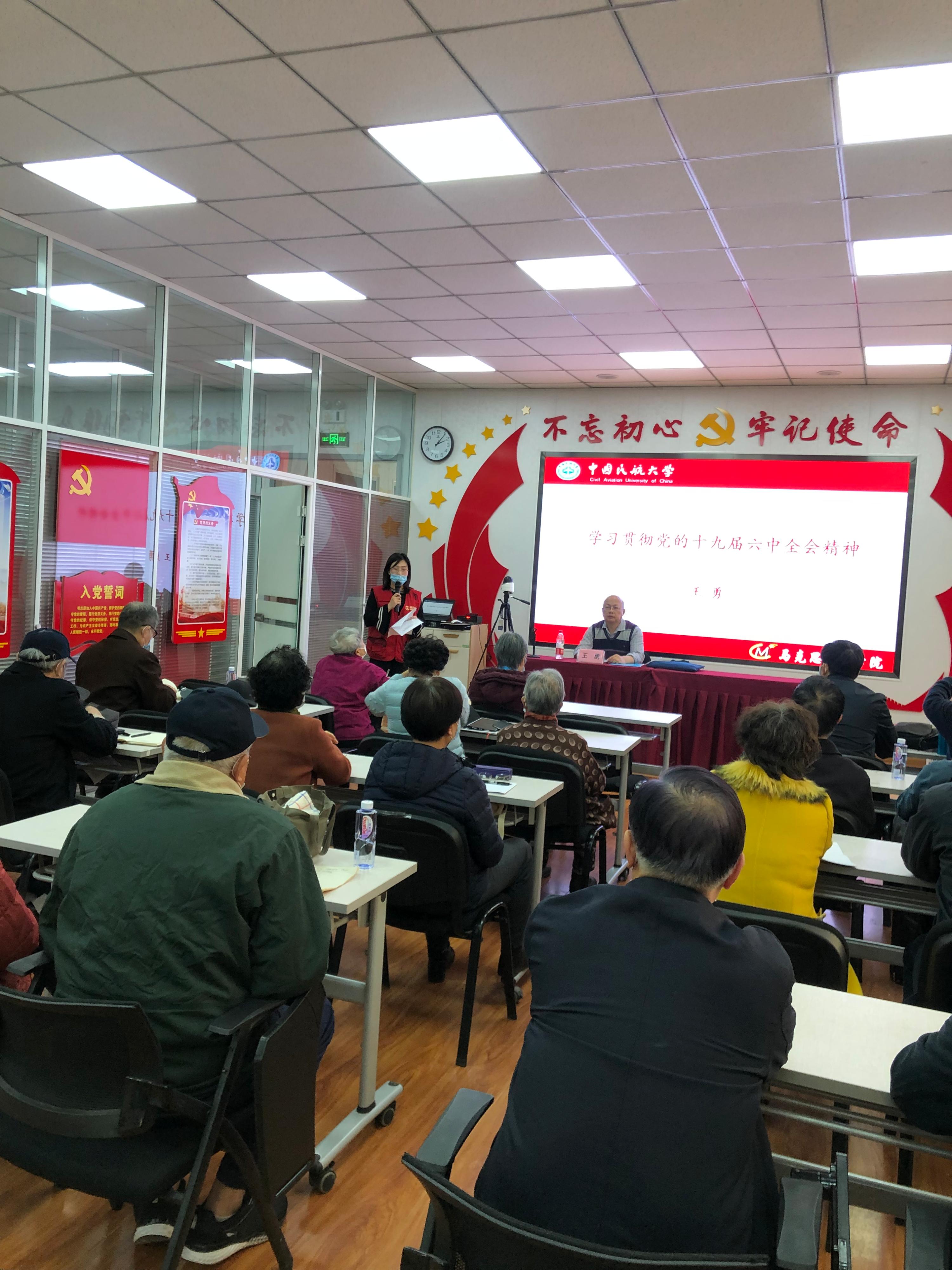 学习活动由双方共同发起,邀请中国民航大学马克思主义学院王勇教授进行首场讲座。王勇教授用详实的图文资料,以时间为轴线,从“开天辟地,实现民族独立、人民解放”、“改天换地,为实现伟大复兴奠定前提和基础”、“翻天覆地,推进了从站起来到富起来”、“惊天动地,新时代的中国朝着强国目标继续前进”四部分内容,回顾了党的百年奋斗历程,并在其中穿插介绍了迄今为止党的三次重大历史决议。在此基础上,深入浅出地讲解了党的百年奋斗的历史意义与宝贵经验,巧妙地将二者有机结合起来,切实引导与会全体同志深刻认识过去为什么能够成功,未来怎样才能继续成功的道理和规律。最后,王勇教授通过“鉴往知来,砺行致远”,在对比中强调要充分认识六中全会提出的“两个确立”,每一名党员都要进一步凝心聚力,增强“四个意识”,坚定“四个自信”,做到“两个维护”,从三个方面不断加强社区与离退休党员的个人修养和党建工作,为推进伟大事业、实现伟大梦想而再立新功。