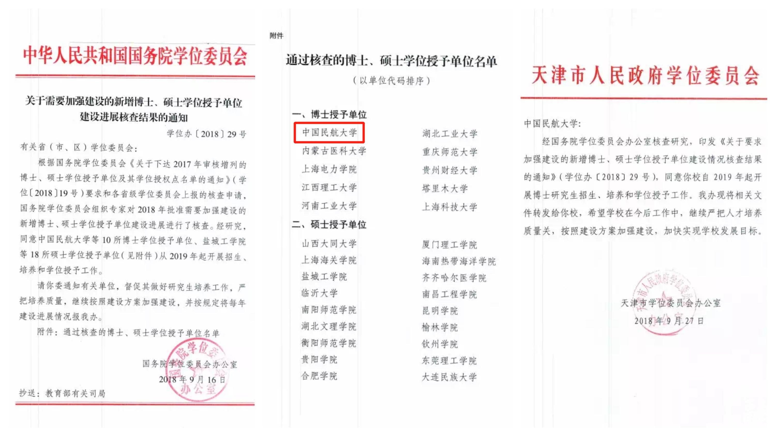 中国民航大学作为民航局、天津市、教育部三方共建高校,在建设发展中得到天津市委市政府大力支持。学校被遴选为天津市高水平特色大学建设行列,在2018年,天津市经过研究决定推荐中国民航大学申报新增博士学位授予单位。伴随着学校成功获批,安全科学与工程一级学科成为新增博士学位授权点,填补了国内航空安全领域博士点空白,更标志着中航大形成了“学士、硕士、博士”完整的学位授权体系。