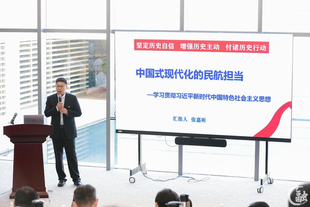中国民航大学马克思主义学院教授张嘉昕以《中国式现代化的民航担当——深入学习贯彻习近平新时代中国特色社会主义思想》为题作辅导报告,从坚定历史自信、增强历史主动、付诸历史行动三个维度,结合中华优秀传统文化系统解读习近平新时代中国特色社会主义思想。围绕中国式现代化的基本内涵和特征,报告深刻阐述中国民航在实现中国式现代化中的贡献与担当,以及在谱写交通强国民航新篇章中,中国民航大学在教育、科技、人才等方面的使命担当。