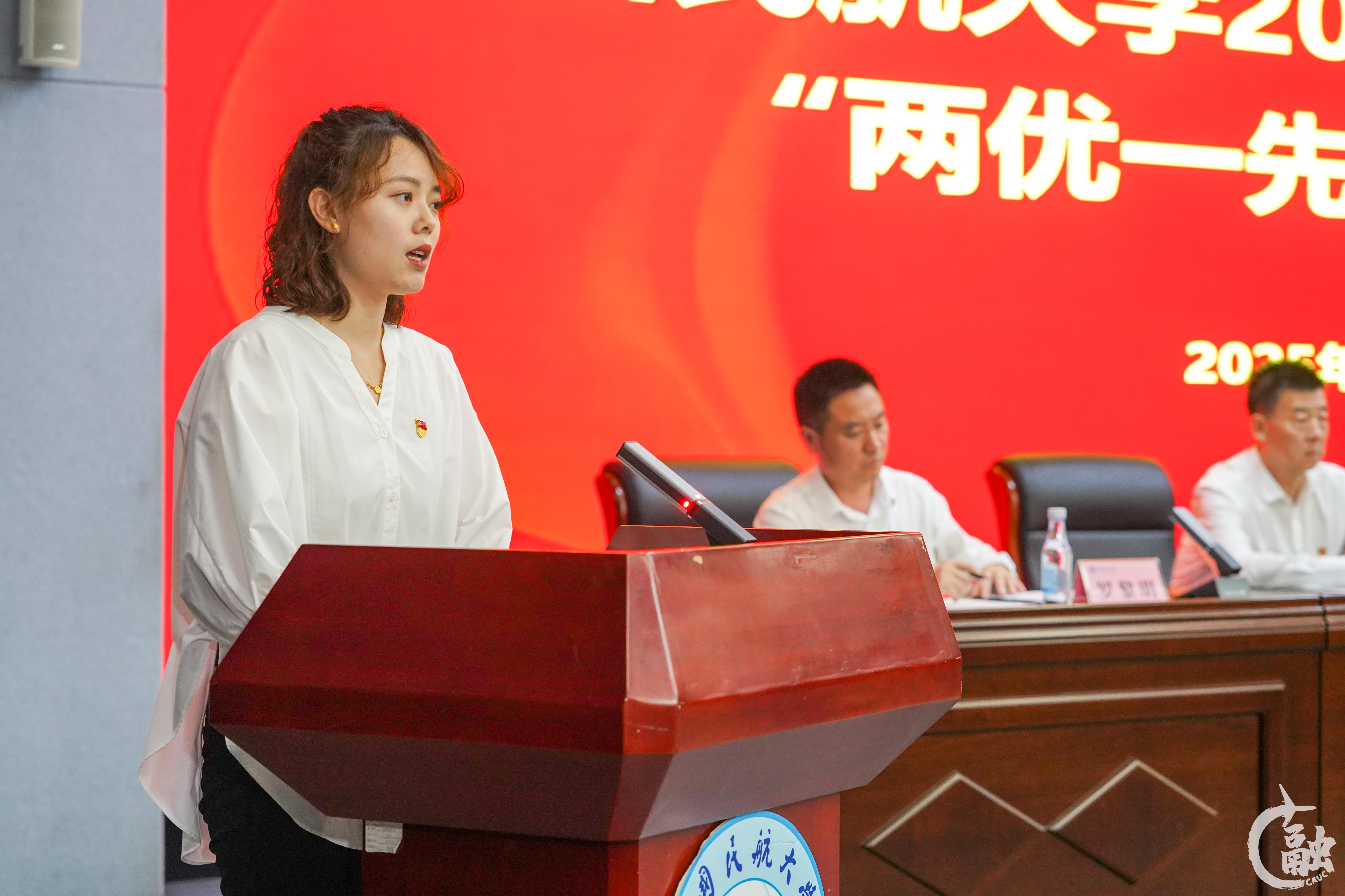 优秀共产党员代表、安全科学与工程学院教师赵长啸在发言中表示,作为一名党员,未来将以荣誉为鞭,继续以忠诚铸魂、责任在肩、敬业于心的姿态,在教书育人与科研创新中践行党员担当,为学校“双一流”建设和国家民航事业发展贡献力量。优秀党务工作者代表、经济与管理学院学生党支部书记郭娜从“向外看构建党建共同体、向内求锻造坚强战斗堡垒、向前走以实干彰显担当”三个方面汇报体会与感悟,并呼吁全体党员、干部站在中国民航大学第三次党代会的历史节点上,扎根育人沃土,以实干笃定前行,以担当诠释初心,为学校高质量党建引领高质量发展注入基层党务工作者的澎湃力量。