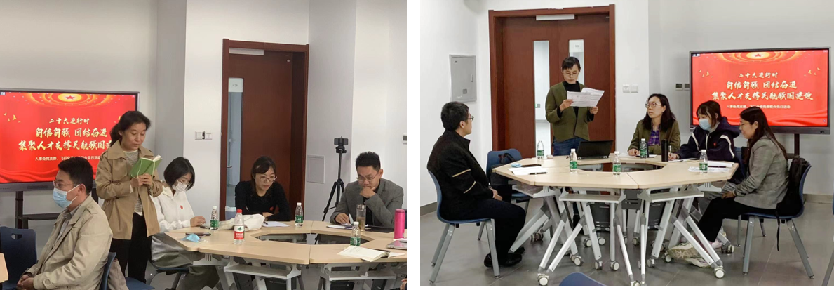“我国正在从民航大国向民航强国迈进,在这一进程中,人才是关键。科研人才、教学人才、管理人才水平快速提升在学校的发展进步、战略打造过程中发挥着至关重要的作用”“作为一名高校人才工作管理人员,我们在实践中要继续完善和优化人才工作,努力在关键领域人才工作方面筹划分类发展模式,努力探寻‘引进来’‘发展好’‘成长起来’的突破口,积极为民航强国战略做出贡献。”人事处党员在发言中向大家分享人才工作发展思路和工作实践中的感想。